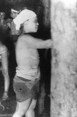 大正期の坑内風景。鉱夫が裸であるのは、異常な風を感知するためであり、