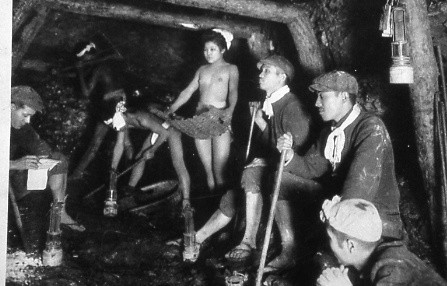 諸枠で保持された切羽で、先山(男性)と後山と番子(女性)が採炭している。 帽子をかぶり座っている人物は保安係か。 帳面付けする人物もいる。 女性は若すぎるが、当時未成年女子の入坑もあった。