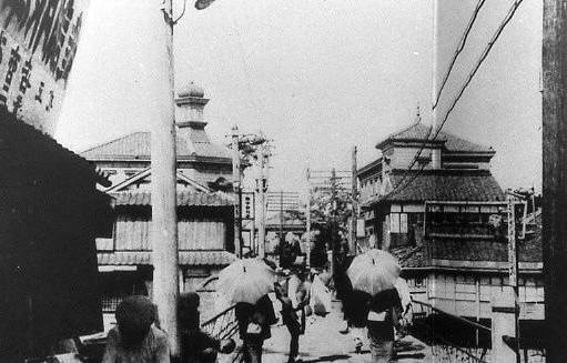 大正末年ころ写真と思われる。右の高い建物は警察署、左の高い建物は宇部銀行であった。