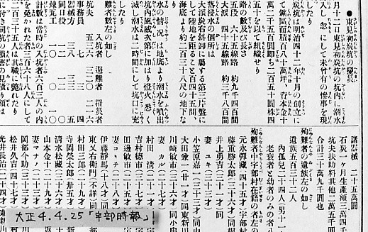 大正4年4月12日正午、大派炭1号斜大通りし左3片詰(海底71m)で、 以前より施工済みのレンガダムを吹き破って海水が瀑流し2時間で坑口まで満水した。2ヶ月前から微候があり、 各所に牛蒡ギコとレンガダムを構築中であったが、断層面を湧水が洗い流し海底に到達し海水が浸入した。 当日の入坑者603人のうち235人の犠牲者を出す宇部炭坑田最大の事故となった。 大正6年に完全に復旧した。