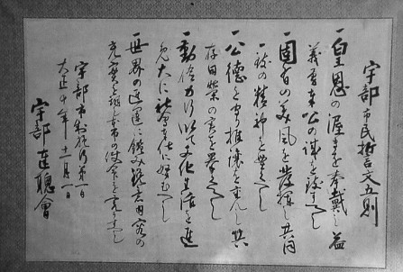 宇部村が市制を施行するにわたって政治団体の宇部達聰会は渡辺祐策等の訂正のうえ「宇部市民誓文五則」を決定した。