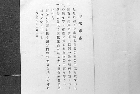 大正10年11月1日市制施行して宇部市」となり、11月23日第一回市議会を開催し、宇部達聰会提唱の「宇部市民誓文王則」を市憲とすることを決議した。 大正10年3月23日、国吉亮之輔宇部市長は「誓文五則」を市憲とする告論を発した。