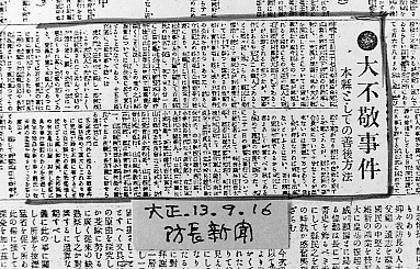 難波大助は日本社会を覚醒させようと決意し、大正12年12月27日、帝国議会開院式に出席中の今上天皇が、 虎の門にさしかかった際、ステッキ銃で狙撃した事件。 内閣は総辞職し、山口県では大不敬事件としてとらえられ思想と教育の問題が重要視された。