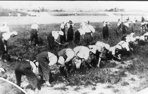 戦時中、昭和19年、20年当時の中学生、女学生の学校教育における授業はほとんど行われず、 軍事教育などが主でもっぱら2・3人のグループに分かれて農家への麦刈り作業、稲刈り作業への泊り込みでの手伝いが多くなっていた。 食料事情も悪化する為、陸上競技場、学校の校庭、周囲の空き地のほとんどがいも畑に変わり、農作業によっての食料増産に励んでいた。