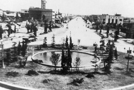 交差点中央のロータリー。右の建物は市役所、左の建物は山口銀行。 宇部市内の戦火復興中の写真。常磐大通りの東と西にロータリーが建設された。