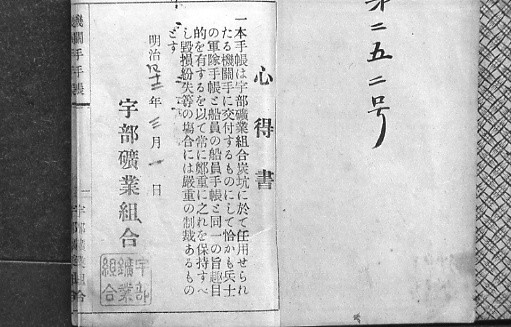 機関手帳の最初のページにある宇部鉱業組合の「心得書」 宇部坑業組合炭坑で働く機関手に対し交付される、心得書。