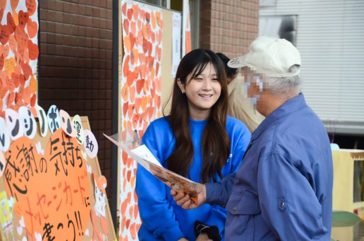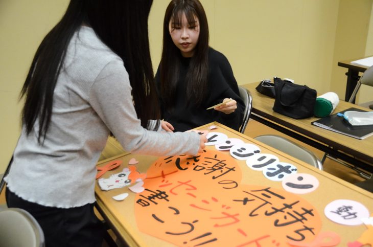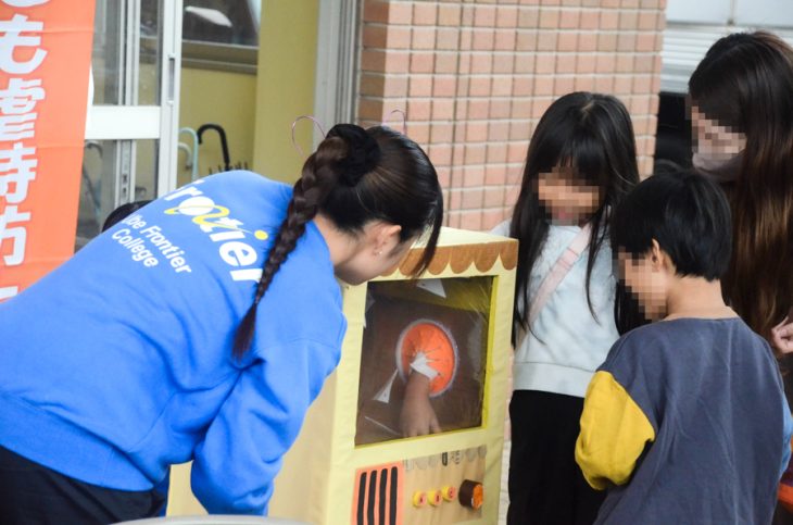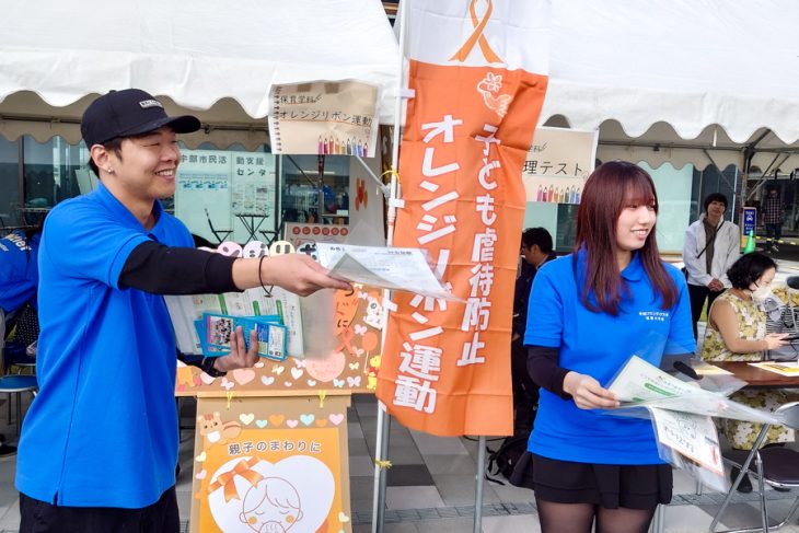 児童虐待防止の啓発活動であるオレンジリボン運動に参加しました。保育学科の学生がオレンジリボンの作成、パネルとチラシ、思いやりの気持ちを表すメッセージカードを準備し、宇部まつりと学園祭でオレンジリボンの配布を行いました。今回は、学生手作りのエアーおみくじを用意し、メッセージカードを書いて頂いた方はおみくじが引ける特典付きで、多くの方に注目してもらえる工夫を加え、取り組みました。